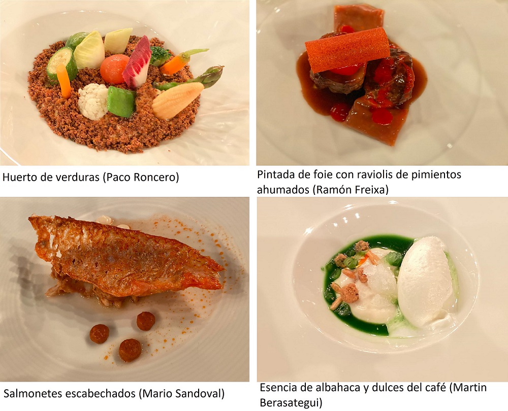 - Menú Cena: Huerto de verduras (Paco Roncero); Pintada de foie con raviolis de pimientos ahumados (Ramón Freixa); Salmonetes escabechados (Mario Sandoval); Esencia de albahaca y dulces del café (Martín Berasategui)