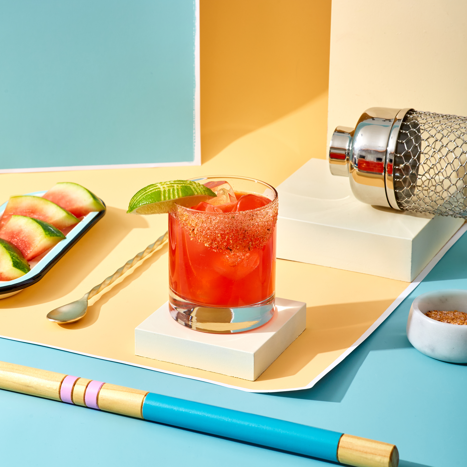 1. Humedece la mitad de un vaso de whisky con lima y cúbrelo con tajín.