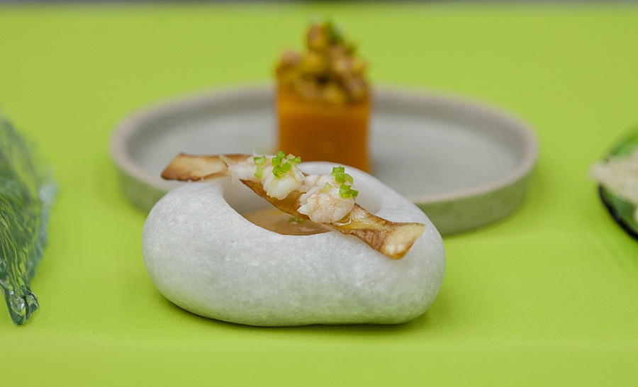 A continuación, se llevó a bocado un Dado de calabaza relleno con guiso de panceta ahumada, aceite de oliva y notas herbáceas. Posteriormente, la experta trajo a consideración del público una versión de la tapa que la hiciera ganadora del "Pincho de oro 2017". En esta ocasión "La Terreta" a la cubana incorporó crema de camarones, base de yuca, especies y, como un modo bien particular de interpretar su región de procedencia, utilizó un guijarro de playa a manera de recipiente. Como hemos visto en estos días, pensar la gastronomía es ir más allá de los estereotipos, incluso en las presentaciones o envases.