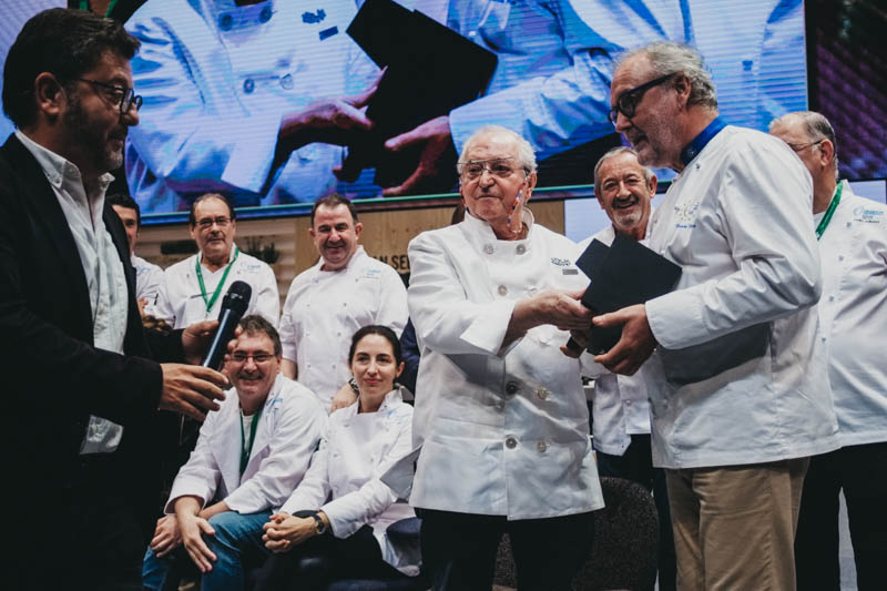 Su compañero y amigo Ramón Roteta le ha hecho entrega del trofeo y todos sus amigos –chefs, colaboradores, personal del restaurante…- han subido al escenario de San Sebastian Gastronomika para acompañarle. En concreto, Joan Roca (El Celler de Can Roca***, Girona) ha loado su figura recordando lo importante que ha sido y es para él: "Cuando te conocí y comí en tu casa, hace muchos años, me dije: Yo quiero ser como Arzak. Y lo he intentado…". Semejantes palabras de agradecimiento y gratitud se han oído también en el vídeo que el congreso ha preparado para la ocasión con las palabras de Rafael Ansón, presidente de la Real Academia de gastronomía. Entre otros, Michael Bras, Mauro Colagreco, Ferran Adrià, Daniel Humm, Ana Ros, Alex Atala, Mitsuharo Tsumura, Pierre Gagnaire, Hiroyoshi Ishida o Tomas Keller hablaban del galardonado finalizando la intervención con un "Aupa, Juan Mari". El aplauso más grande del mundo. "Me he emocionado de verdad", reconocía el chef. Gratitud eterna.