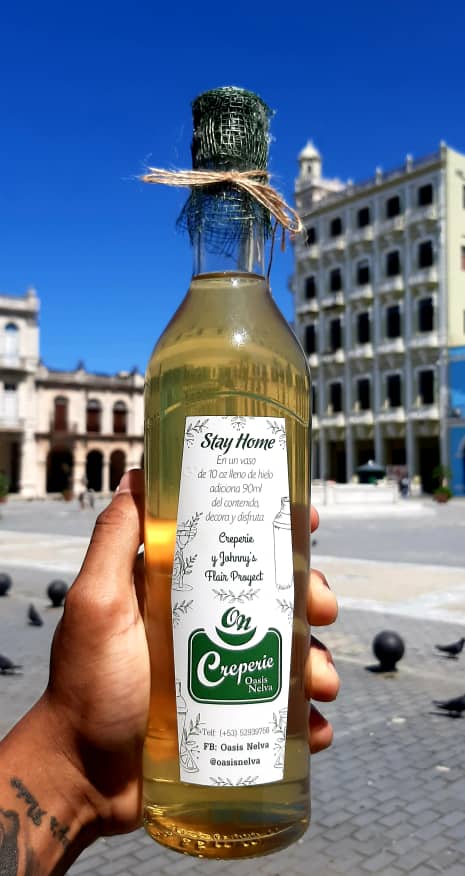 Y llegó la crepería Oasis Nelva. Dos años llevaba el establecimiento dejando una impronta en la Habana Vieja con sus viernes de autor y el quehacer de sus cantineros en términos de drinks y manifiesta libertad creativa. El flairtender John Gerald se sumó al empeño y, cuando llegó la epidemia el cierre le puso a buscar alternativas de elaboración mientras pasaba los días de confinamiento en la reverdecida terraza de Carmen Monteagudo, gestora del restaurante. De ahí surgió la idea: tomar lo que se tiene y potenciarlo. Se pusieron manos a la obra. Así aparecieron el Stay Home y el Be Safe, cocteles Ready to Drink decididamente herbales y frutales, tan frescos, veraniegos y carismáticos como su autor (quien además colabora con la tienda Beyond Roots en la creación de Ashé, otro RTD). Todos son aperitivos y, como tal, invitan. En boca el cítrico no habla tanto como ese dulzor de piña macerada, o quizás plátano u otra delicia tropical. Y están las hierbas aromáticas que en su frescor inundan el paladar de recuerdos de albahaca, hierba buena, menta y algún que otro guiño oculto. No son iguales, pero llevan semejante huella. Sus envases -como en los otros dos emprendimientos- también responden a una vocación de reciclaje, reutilización y resignificación. La idea es tener un ciclo cerrado de aprovechamiento en la crepería y las "veganitas" (especie de chips exclusivas de Oasis a partir de una crepe vegetariana) que acompañan cada pedido de estos tragos son un ejemplo. Ellos pensaron su coctel para ser servido sobre hielo y así lo indican en los envases de diversos formatos que comercializan. Además, suman frutas deshidratadas para completar la decoración. Una delicia.