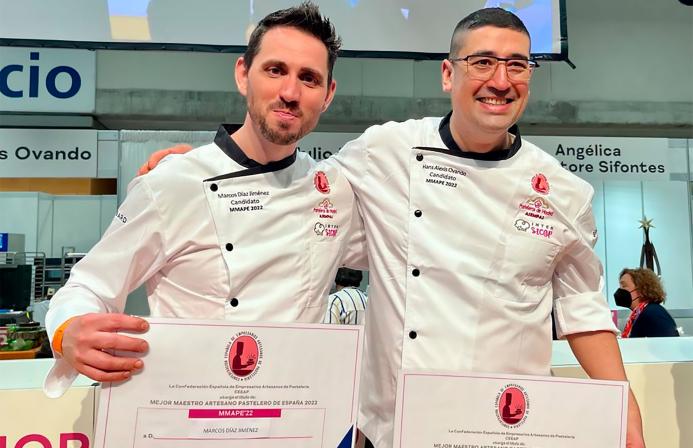 Marcos Diaz Jiménez, de la Pastelería Rossana de Calafell (Tarragona) y Hans Alexis Ovando, de origen chileno y responsable de la escuela de Formación Be Chef Pastry School en Barcelona, se proclamaron ganadores del MMAPE después de dos días de competición y la elaboración de un buffet compuesto por un pastel de viaje, pastel de chocolate y fruta, una rosquilla frita u horneada, un bombón de corte y otro de molde y una pieza artística de chocolate, azúcar o mixta.