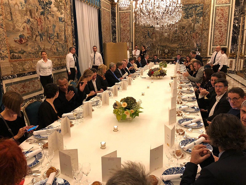 Más tarde, se sirvió una cena en la embajada, preparada por Mario Samdoval y Romain Fornell, consistente en un guiso de boletus edulis con pilpil de rocoto y piñones (regado con un vino Hatzidakis Cuvée Nº 15. Grecia); un escabeche de foie al oloroso con mango encurtido y piel de picantón crujiente (regado con Palo Cortado Viejo C.P. Jerez); una lubina al velo de estragón y ceps (regado con vino chardonnay de Bourgogne); y de postre, Montblanc de castañas (regado con un Pedro Ximenez. Jerez).