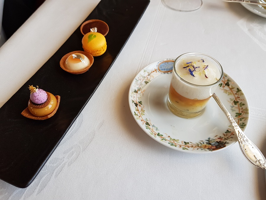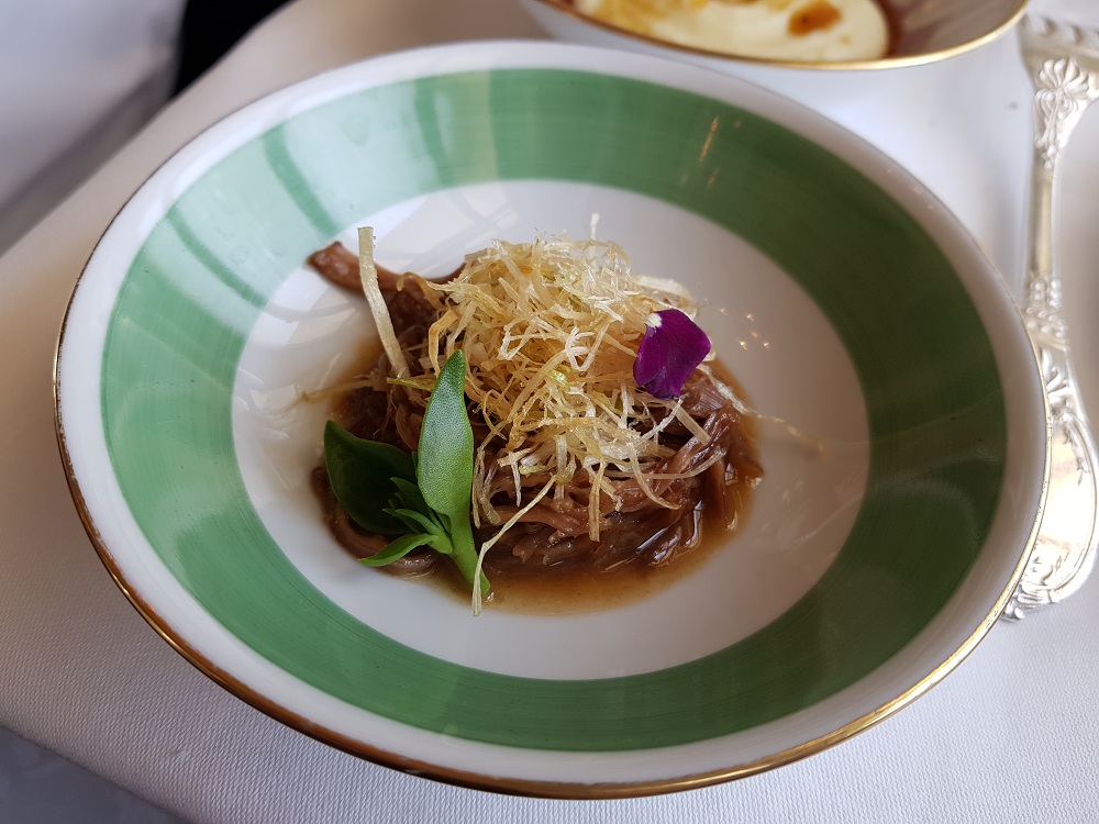 Por otra parte, otro plato como el filete de cordero, raíz de perejil en puré de patatas fino y ñoquis de nogal, es un emblema de su carta. Guy Martin trabaja con precisión el jugo de pimienta de Jamaica que influye muy postivamente en su cocina tradicional sin distorsionarla.