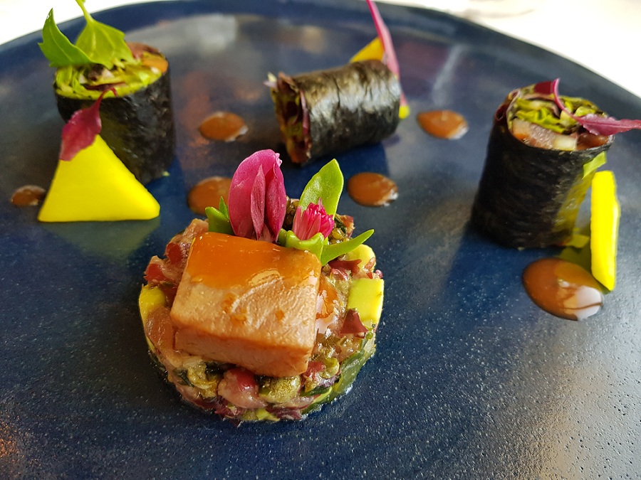 Cada plato resulta un lienzo de gran maestro. Mil sabores del mundo se concentran alrededor de creaciones como el ravioli de foie gras, el tartar de langostinos, el filete de cordero gratinado y aromatizado con ajedrea y servido con tomates verdes y un pastel de guisantes (excelente plato, muy tierno y presentado de manera magistral) o la caja de chocolate con sorpresa de frambuesas, fresas y bolitas de chocolate rellenas de almíbar de fresas.
