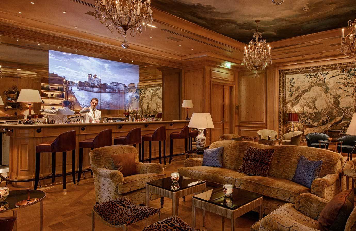 El mencionado Bar, que se abre a un vestíbulo elegante, ofrece un nuevo aspecto siempre en su propio espíritu. Situado en el centro de la planta baja y en forma circular, el mostrador está colocado entre cuatro columnas de mármol rosa. A la izquierda, el salón María Antoinette donde se muestra el retrato de la reina homónima. Al fondo, la alcoba que ofrece una intimidad amortiguada a los matices carmín. El ambiente musical, confiado a Béatrice Ardisson, se adapta a los diferentes momentos del día. Los primeros rayos del sol son una invitación para disfrutar del jardín.