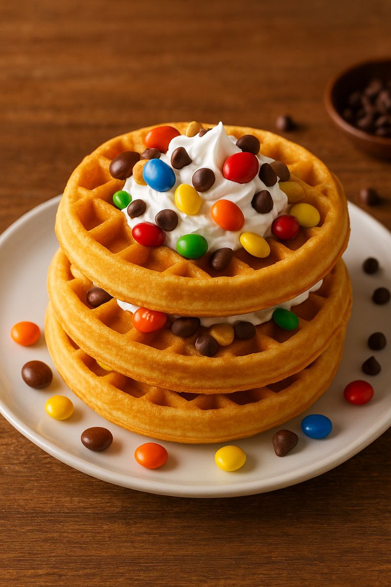 2. Coloca un gofre como base y añade 1/2 taza de crema batida. Pon encima el segundo gofre, más crema batida, y remata con el tercero y el resto de la crema. Espolvorea con los chocolates, los caramelos afrutados y las piezas de crema de cacahuete. Hazle una foto: te lo has ganado.