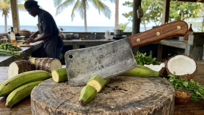 De ahí que este tipo de cuchillos se desdobla como herramienta ideal lo mismo para partir un coco que trocear carnes con hueso o preparar platos como el chivo guisado, donde el sabor depende precisamente de esos cortes irregulares que liberan jugos y gelatinas.